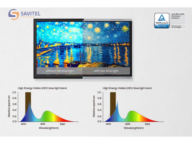Màn hình được xây dựng theo hướng tiếp cận bảo vệ mắt toàn diện, kết hợp việc lọc ánh sáng xanh vùng 400–450nm và giảm bức xạ xuống chỉ còn 11,25%. Điều này giúp đôi mắt hạn chế mệt mỏi ngay cả khi sử dụng liên tục trong nhiều giờ.